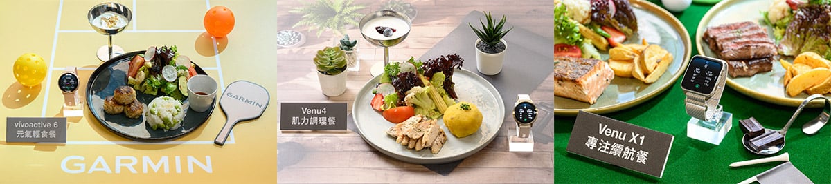 - Venu X1:史上最輕薄旗艦級智慧腕錶,「法式灰」色系全新登場,以低調洗鍊的色調與俐落線條,勾勒出從容自信的商務菁英風格,兼顧職場、社交與高爾夫運動場景轉換,並由營養系教授推薦「專注續航」菜單,選用精緻牛肉或魚排為主食,提供長時間專注與體力表現所需的營養支援。
